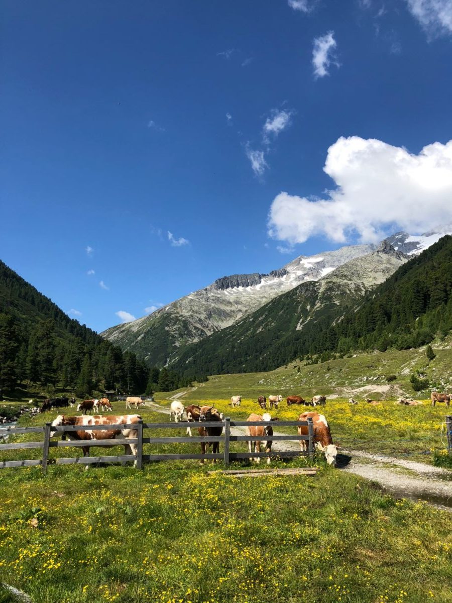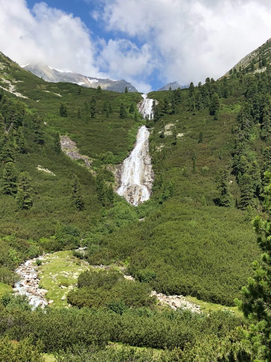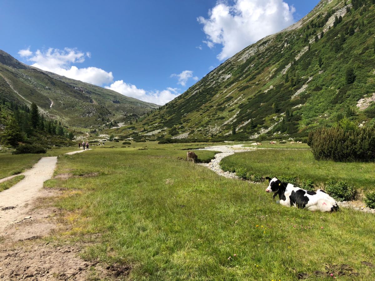Der Tag, an dem der Alpenhauptkamm überschritten wird. Von Mayrhofen läßt man sich per Linienbus zum Schlegeis Speichersee auf 1.800 Meter Seehöhe chauffieren. Schon hier hat man einen Traumblick über den hellblauen See und zu den mächtigen dahinterliegenden Gletschern. Der Anstieg zum Pfitscherjoch führt über einen komfortablen Steig vorbei an Wasserfällen und entlang des mäandrierenden Bachs. Kurz nach der italienischen Grenze liegt das Pfitscherjochhaus, mit 2.275 Meter der höchste Punkt des Tages. Über sanfte Almwiesen und einen Mischwald wandert man hinab zum Talboden des Pfitschtals. Auf einem leicht erhöhten Wiesenweg erreicht man St. Jakob, den ersten Weiler der Gemeinde Pfitsch. Unterkünfte findet man entlang der Strecke zwischen St. Jakob und dem rund fünf Kilometer entfernten Kematen.