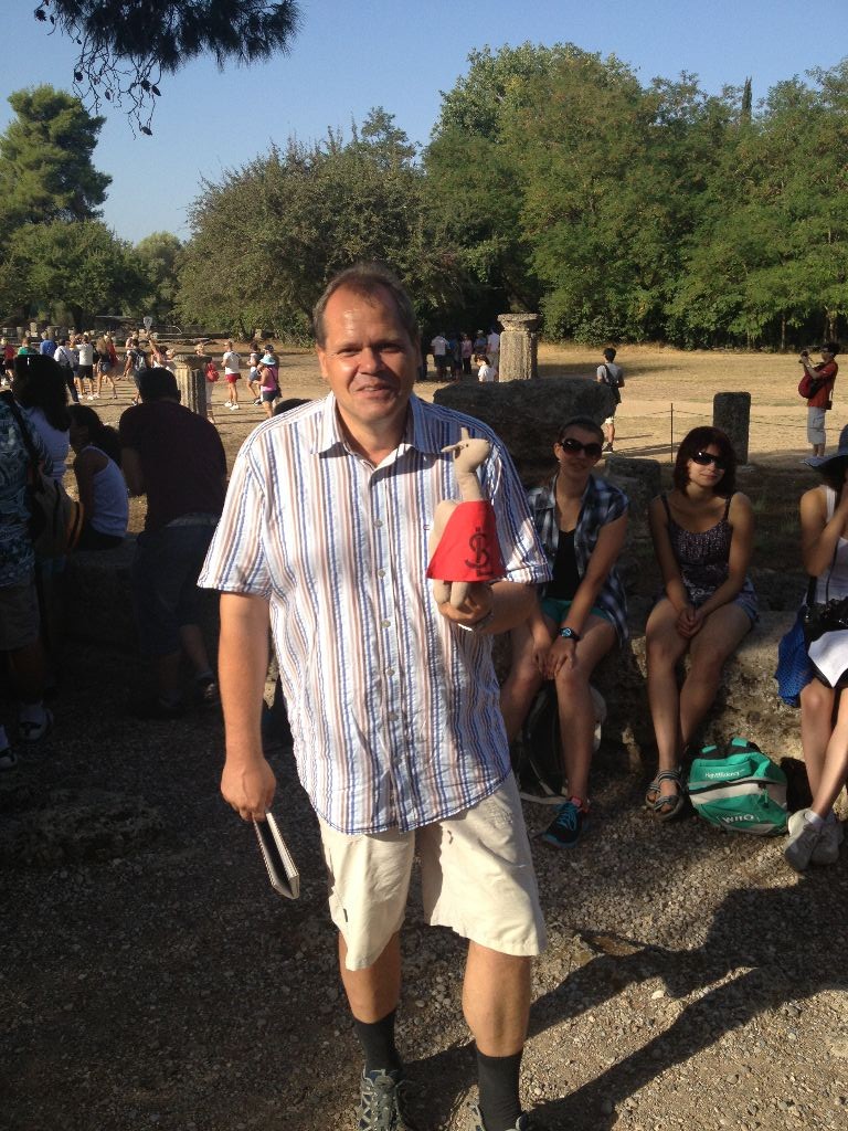 Kaum auf dem Gelände suchten wir eine geeignete Säule für das SuperLama. Schnell hatte ich im Palaestra (dem Trainingszentrum für Ringer, Boxer und Weitspringer) eine von der warmen Morgensonne angestrahlte Säule gefunden. Leider hinter der Absperrung. Angespornt durch den Capucino und durch Jörgs motivierende Worte „nun mach schon“, kletterte ich drüber und platzierte das SuperLama. Schnell war ich aus dem Motiv und Jörg machte zwei Fotos. Da ertönte ein schrilles Pfeilen. Jörg meinte „das gilt nicht uns“ und so eilte ich zur Säule, holte das SuperLama und als ich es gerade im Rucksack verstaute war eine resolute Fremdenführerin mit Haaren auf den Zähnen neben uns und meinte „no photos with toys“. Diesen Satz kannten wir bereits aus Epidaurus und aus Delphi. Jedoch war es dort mit einer freundlichen Verwarnung abgetan. Hier sollte es anders kommen.