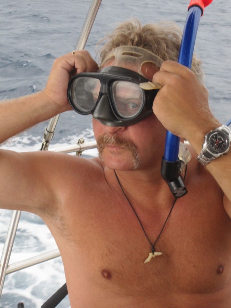 Robert und Sigi zogen blitzschnell Ihre Badehosen, Tauchermaske und Schwimmflossen an, um mit den Delphinen zu schwimmen.