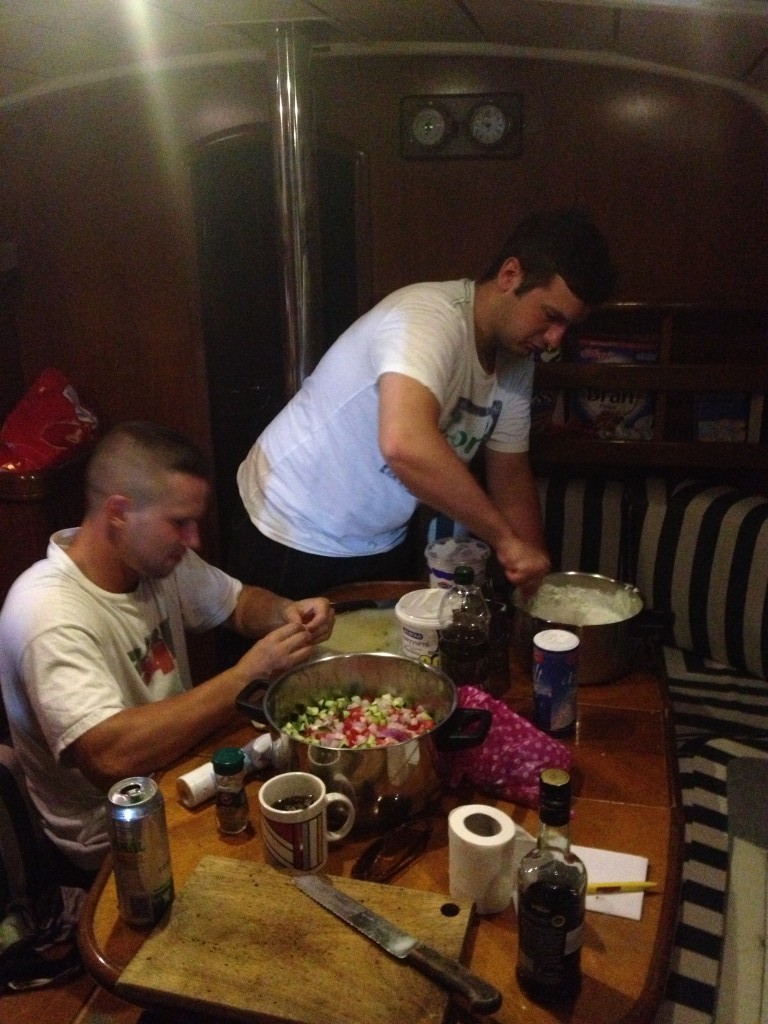 Nachdem wir die 1,84 EUR Hafengebühr und die 5 EUR für den Strom bezahlt haben machten sich Norman und Dominik an die Zubereitung des griechischen Salates und des Tsatsiki. Alle waren total begeistert!!